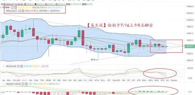 從日線級別來看,最近一周的行情都是維持在BOLL中軌處上下波動,各均線系統也來到BOLL中軌處對目前的比特幣行情進行壓制和支撐;昨日比特幣收取一根帶有上影的小陰柱形態;從圖中可以看出,目前比特幣行情一直維持在三角區域運行,而且可供運行的區間越來越小,同時也意味著當三角區域走完之后,行情一定會面臨變盤;下方KDJ指標三線向下發散,能量指標MACD快慢線依然粘合運行在零軸下方,綠色多頭能量微弱釋放中;綜合來看,易天老師(aphz8705)認為今天BTC的行情沒有任何大的波動,區間依然會維持在9150-9350之間盤整!