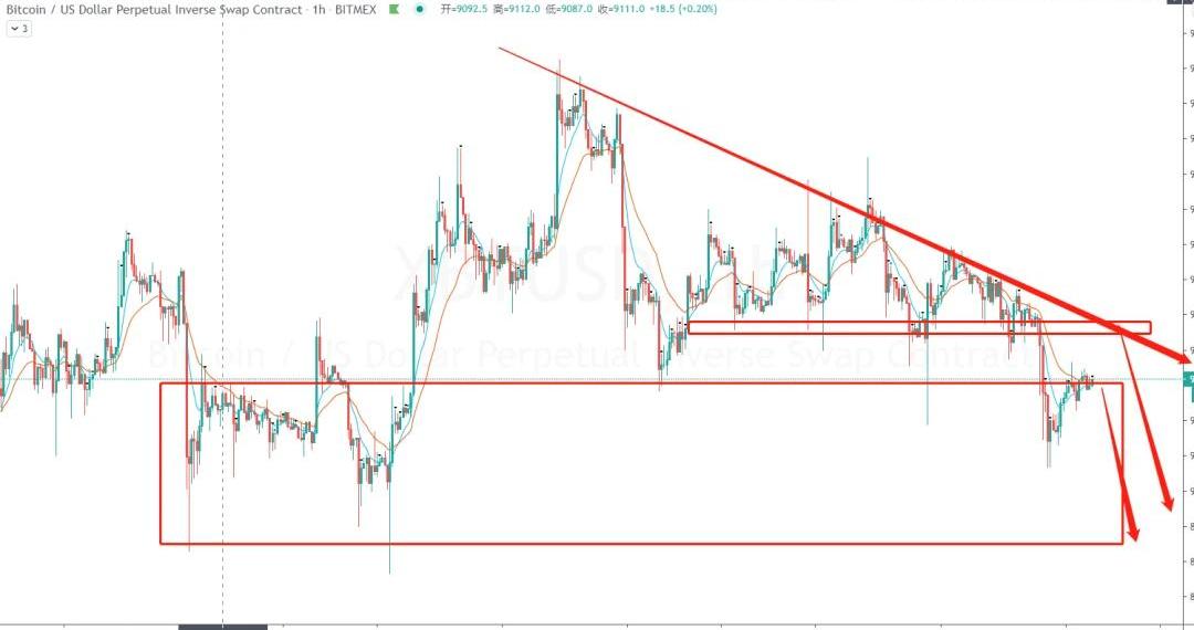 空頭趨勢,價格目前測試9150附近的壓力,多頭幾次都上不去,有可能出一個針直接就下去了,可以關注做空機會,如果破了也無需擔心,上方做空的位置更好