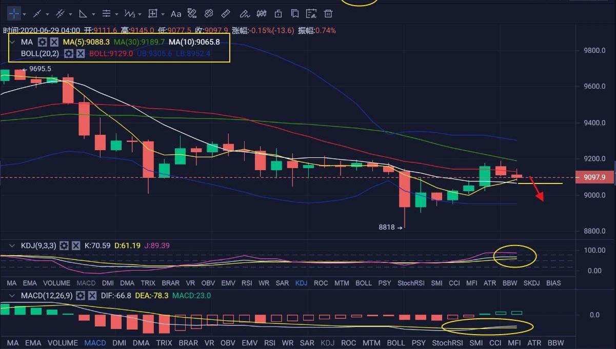 再從4小時圖來看一下,BOLL通道由下行通道變為現在的平行運行,昨日收線時的一波上攻,行情已經已經刺穿了BOLL中軌的壓制,受到綠色MA30均線的壓制開始回落,目前已經回到BOLL中下軌區域,下方支撐在黃色MA5(9086)和白色MA10均線(9064)處;下方KDJ指標金叉向上但J值已經走平,有再次勾頭向下形成死叉的跡象;能量指標MACD快慢線形成水下金叉形態,多頭能量初步釋放中;綜合來分析,易天(aphz8705)認為日間行情會持續走回調,下方支撐一旦破位,那么行情就會進入快速下跌通道!