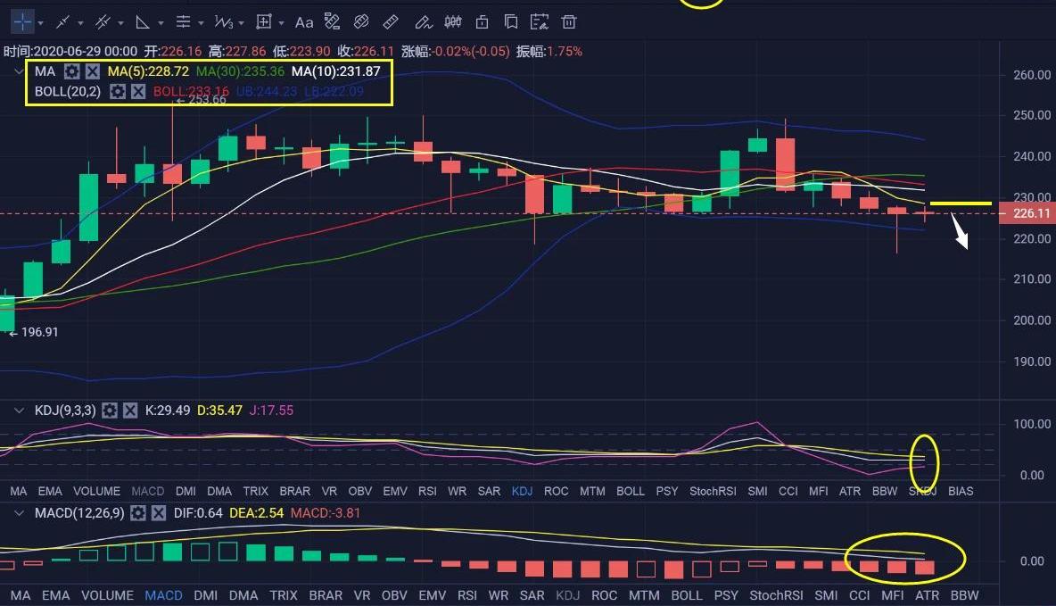 從日線級別來看,昨日ETH收取一根帶有長下影線的倒錘陰線,下影線完全刺穿日線BOLL下軌,但是收盤的時候,又回到來了BOLL通道中下軌區域;目前行情承壓在黃色MA5日均線處,上方也進行和BOLL中軌平行向前運行對行情進行壓制;下方KDJ指標死叉向下運行,但是紫色J值已經抬頭向上,有繼續形成金叉的跡象;能量指標MACD快慢線依然平行向下運行在零軸上方附近,空頭能量持續釋放中;綜合來看,易天(aphz8705)認為目前行情需重點關注黃色MA5日均線壓力處,此處壓力不破位企穩,那么后市以太坊行情依然要繼續大跌!