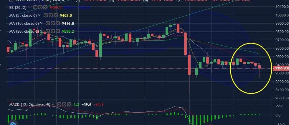 從日線級別來分析,昨日收取一根帶有上下影線的實體陰柱,下影線再次刺穿了日線BOLL下軌通道,收盤于BOLL下軌附近;隨著這幾日的連續收陰,日線BOLL通道有向下開口的趨勢,目前行情在BOLL下軌附近運行,黃色MA5和白色MA10日均線粘合向下勾頭,對目前行情進行壓制,BOLL中軌也開始勾頭向下;下方KDJ指標死叉向下運行,但J值已有勾頭向上趨勢,能量指標MACD快慢線粘合運行在零軸附近,空頭能量持續釋放中;綜合來看,易天(aphz8705)認為今日BTC整體會維持區間震蕩,上方壓力在各均線粘合處(9430),下方支撐在BOLL下軌處(9050)!