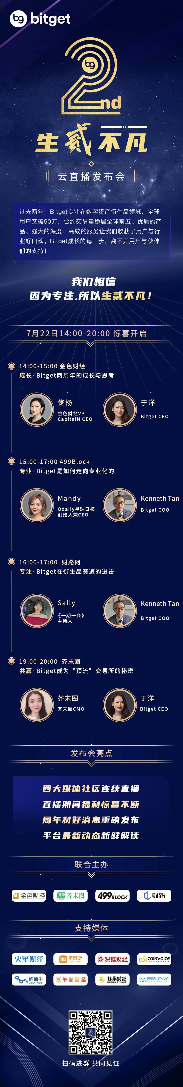 Bitget將于新加坡時間2020年7月22日迎來兩周歲生日。為慶祝平臺兩周年和答謝用戶與合作伙伴,Bitget將于下周起,舉行生日狂歡周系列慶祝活動。屆時,平臺將逐步揭曉Bitget全新戰略布局,最新融資動態等,同時,平臺亦會在各大媒體平臺開啟周年生日趴等系列直播活動。