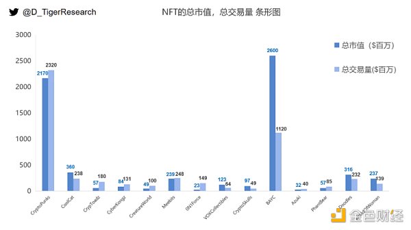 圖4-1 15種NFT的總市值和總交易量條形圖,截至2022-01-19