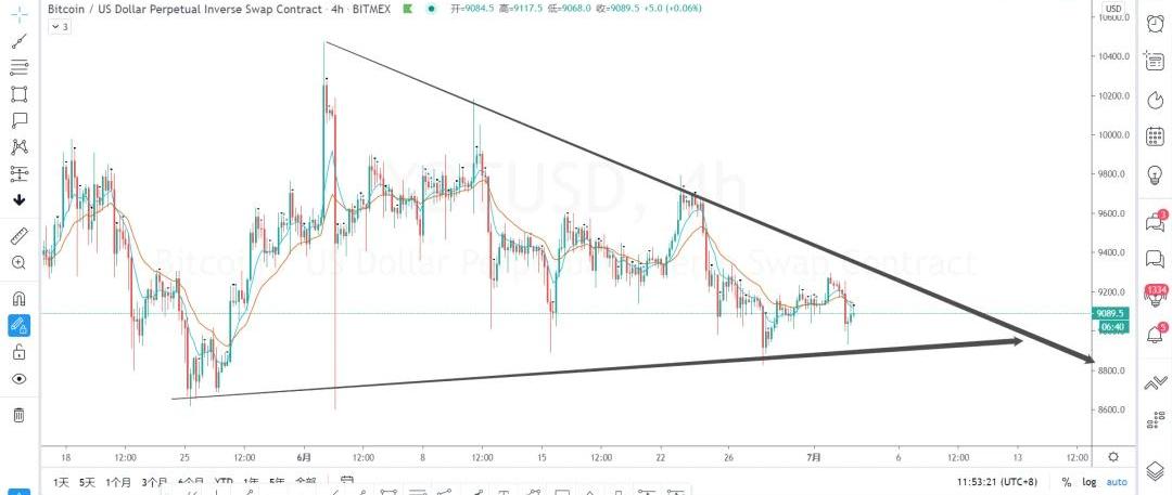 4小時三角收斂末端,持續縮量震蕩是主要行情,留意下邊沿的三角下沿被突破的做空機會,方向偏空,向上突破一定要放量站穩9300,現在沒什么興趣介入,等突破確認站穩之后再做就好了