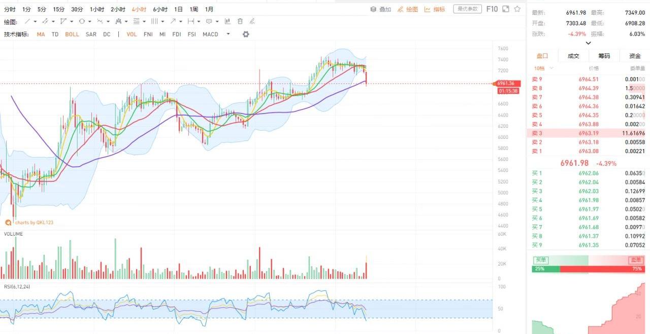 BTC橫盤震蕩之后,于今日開始下探支撐,目前開始小幅放量下探,市場資金凈流出明顯。剛剛最低下殺至6900美元后觸及10日均線,抹平了前幾日的漲幅,這給后續走勢帶來較大不確定性。短時四小時RSI臨近超賣,有反彈的可能。