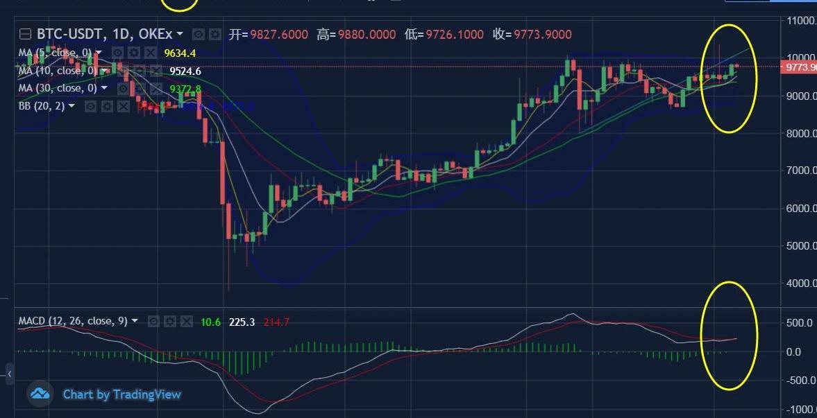 再從4小時圖來看一下,目前比特幣行情運行子BOLL通道中上軌之間,下方各均線系統有序抬頭準備上穿BOLL中軌形成行情下方支撐,且黃色MA5日均線已完成上穿動作,在今日開盤之后行情上沖9900一線阻力位但未有觸及就開始承壓回落,目前觸及下方MA5均線支撐開始小幅區間震蕩;下方能量指標MACD快慢線已經形成水上金叉跡象,且從空頭能量轉為多頭,能量持續釋放中;綜合來看,易天(aphz8705)認為雖然比特幣日間行情會比較微弱,但是下方支撐會隨著均線系統的上行逐漸越來越高,整體行情會表現為震蕩上行趨勢!日間操作重點關注下方支撐9650附近,上方壓力重點關注9900阻力位!