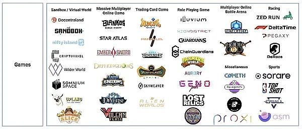 游戲工作室位于基礎層,因為它們通常是游戲開發商,也是 L1和 L2 基礎設施的開發者。Dapper Labs(開發了 CryptoKitties 和NBA Top Shot 等知名 NFT 項目)、Sky Mavis(開發了 Axie Infinity 游戲) 和Animoca Brands(旗下的區塊鏈游戲包括 The Sandbox 和Crazy Kings 等)是擁有數億資金的最富有的游戲開發商。最終,并非所有游戲工作室都能生存下來。然而,那些開發下一款重磅游戲的公司有潛力成為未來的下一個 Electronic Arts(藝電游戲公司)。