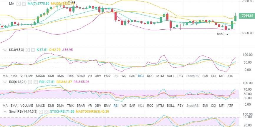 今日價格早間再度下跌,空頭力度強勁,下方6600支撐被打破,隨后在6480位置找到支撐,價格反彈上行至6600一線區域進入調整。多頭一直處于弱勢,價格上行極度困難,但在午間三點左右,市場得到大量資金注入,價格在短時間上行至幾百點,最高至7150,現價7044。