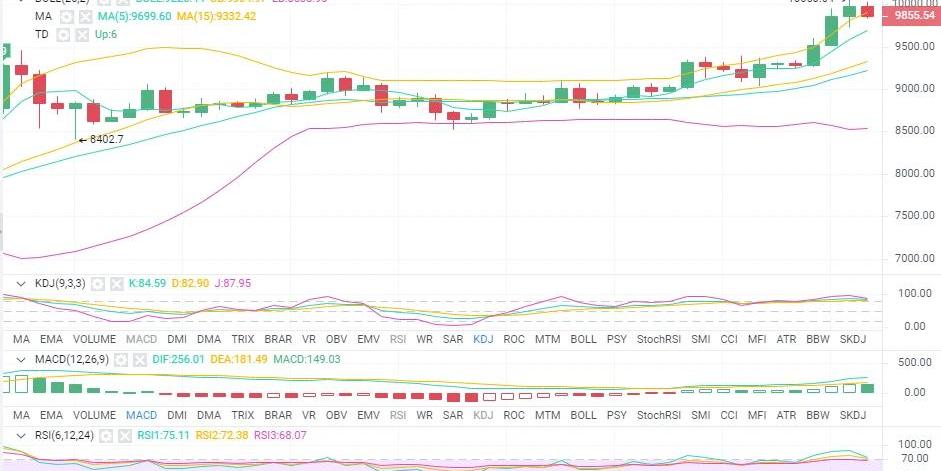 BTC:四小時圖上看,價格早間上行突破布林帶上軌位置后,目前再次回落到布林帶上行通道內運行。布林帶呈現開口向上姿態。5日舉行年持續上攻,目前運行于9700附近支撐價格。整體來看,比特幣價格在觸及萬點之后受到空方的反撲,但是目前價格的上攻之勢仍然強勁,后續價格再次上探萬點是非常可能。日內的操作上建議回調多單為主,若有效破位10000點則順勢跟進。