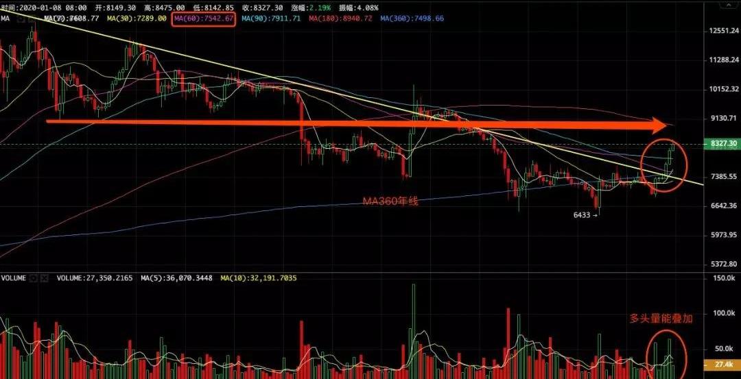 從目前的走勢看,盤面是比較健康的,日線級別,連續幾日的多頭量能疊加,大盤先后站上了MA360年線、MA60中期均線,也突破了19年6月底以來的中長期下降趨勢線的壓制。可以說,目前BTC的現實壓力就只有9000美金關口了。