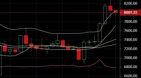 四小時級別圖中,布林帶收口,行情從布林帶的上軌邊緣不斷的向中軌附近靠攏,現已跌至五日均線下方運行,位于7966;而凌晨剛近的那一波跌勢最為強勢,一根大陰K線直拉300多點,并成功的將其8000關口破位,才讓整個局勢出現了翻天覆地的變化;而技術指標中,MACD在零軸上方運行,呈現死叉狀態;RSI和Stoch均保持著向下放量的狀態運行著;由此可見短期行情也以向下試探為主。
