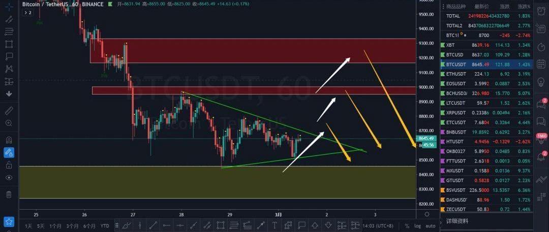 上面說了,目前行情是在一個相對低位的震蕩收斂行情,可以關注三角收斂上沿的位置,參考價格8734,上方比較合理的關鍵開空位置在9000、9200,不放量突破9200我都不太會考慮趨勢反轉的可能