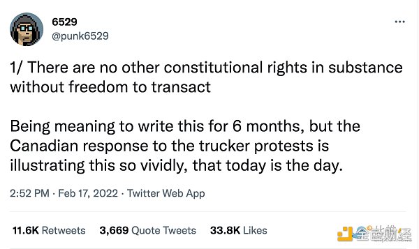 順便說一句,我本人對它的支持并非源于“某種自由主義哲學或其他”,而是基于實際現實——引用化名 Web 3 思想領袖 6529 的話:“沒有交易自由,就沒有其他實質上的憲法權利”。政府宣稱支持言論自由是很好的,但如果他們阻止公民獲得或發送資金來支付電腦或互聯網訪問費用,他們實際上就在否認這個權利。