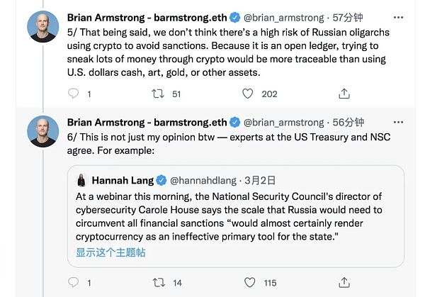 我們已經看到了一些關于是否可以使用加密資產來躲避制裁的問題及討論,以下是一些想法。每一家美國公司都必須遵守法律,無論你的公司是否處理美元、加密資產、黃金、房地產甚至是非金融資產,這都無關緊要。制裁法適用于所有美國個人和企業。因此,認為像 Coinbase 這樣的加密公司不會遵守法律是錯誤的。我們當然會這么做。這就是為什么我們會根據全球觀察名單篩選注冊我們服務的人,并阻止來自可能屬于受制裁個人或實體的 IP 地址的交易,就像任何其他受監管的金融服務業務一樣。話雖如此,我們認為俄羅斯寡頭使用加密貨幣來躲避制裁的風險并不高。因為它是一個開放的賬本,所以試圖通過加密貨幣進行轉賬,要比使用美元現金、藝術品、黃金等其他資產更容易追蹤。順便說一句,這不僅僅是我的觀點,美國財政部和NSC的專家都同意這個觀點,例如: