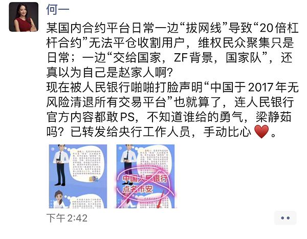 不過,幣安聯合創始人何一在朋友圈中“內涵”圈內其他交易所表示,“某國內合約平臺日常一邊“拔網線”導致“20倍杠桿合約”無法平倉收割用戶,維權民眾聚集只是日常;一邊“交給國家,ZF背景,國家隊”,還真以為自己是趙家人啊?