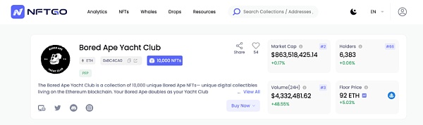 比如根據 NFTGO 平臺統計,截至撰稿,BAYC(無聊猿)系列 NFT 24 小時交易額超 433 萬美元,增幅達 48.55%,該系列 NFT 地板價為92個 ETH,24小時漲幅5.03%。