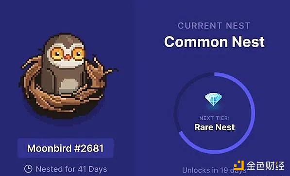 當進入筑巢狀態之后,Moonbirds 將開始自動積累額外收益,除此之外,隨著時間的推移 NFT 本身的形態也會發生相應變化。持有者可以讓自己的 Moonbird 進入“筑巢(Nesting)”狀態。進入筑巢的鎖定狀態后,Moonbirds NFT 將無法正常通過 OpenSea 等二級市場交易(會在買方下單時提示),但依然可以在 PROOF 所提供的網站內通過親手簽名的形式轉移至其他地址,這一設置的目的是為了防止一些常見的遠程函數調用釣魚手段。