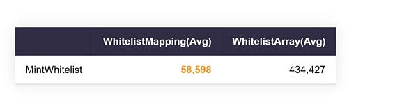 在下表中,我們比較了一個使用映射的合約和另一個使用Merkle樹的合約的白名單Mint函數: