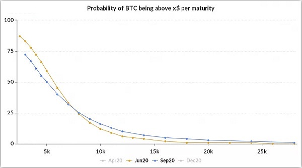 比特幣目前的交易價格約為6,450美元,但是與2017年12月創下的近2萬美元歷史高點相比其實下跌了超過200%。根據加密衍生品分析公司Skew提供的數據顯示,期權市場顯示比特幣在2020年底之前突破2萬美元的可能性只有4%。實際上,按照Skew分析的期權市場數據表明,比特幣價格到2020年12月底升至1萬美元的可能性也很低(如下圖所示)。