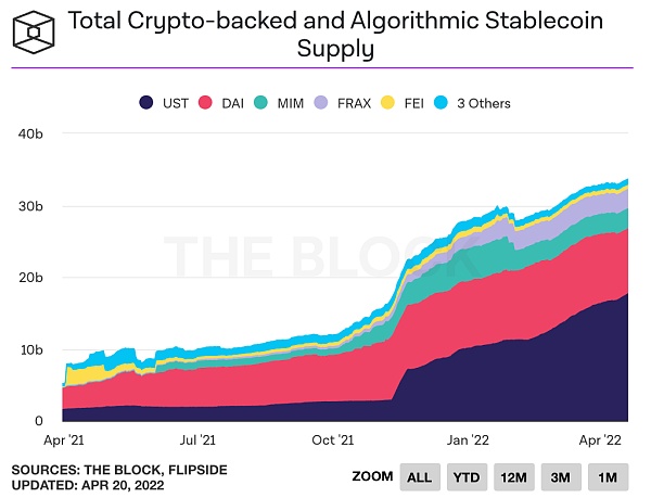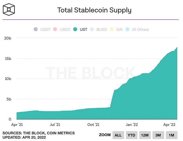 上圖:過去一年中 UST 穩定幣的供應量增長情況。數據來源:?The Block