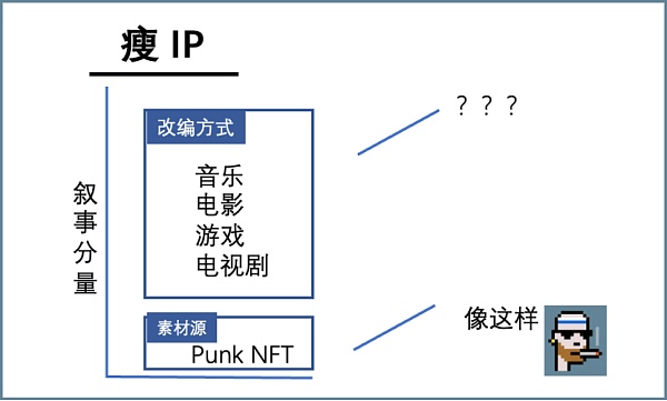 而無聊猿為代表的個人資料(pfp)NFT卻大不一樣,它沒有可借鑒的知識或人物深度,只專注于身體特征,膚色、發型和配飾等,而它的性格、個性和內心世界我們一無所知,發明者也沒有進行定義。這類的IP在敘事分量方面可以說是非常單薄,也同時給后續的開發者更多的創作空間,我們可以稱之為“瘦IP”。