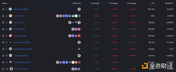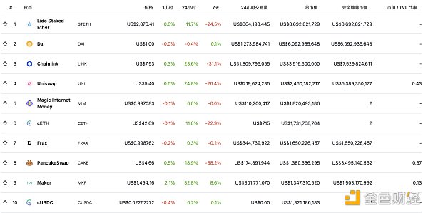 DeFi項目鎖定資產前十排名及鎖倉量 數據來源:defillama