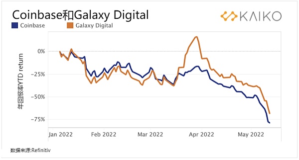 由于加密市場遭遇各種不利因素,Coinbase和Galaxy Digital的股價自4月份以來大幅下跌。Coinbase的收入和交易量大幅下滑,而Galaxy Digital因加密投資回報不佳而導致了3億美元的季度虧損(Galaxy是Luna的有力支持者)。