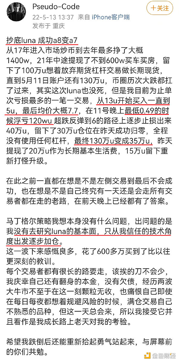 錯誤,因為在任何時間點,都不能預測Luna的漲跌,除了在剛脫錨時,Luna下跌的概率比較大以外,其余時間點Luna做空的贏面都不穩,舉一個做空Luna反被爆倉的例子: