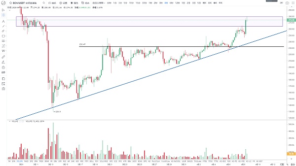今日反彈之星BSV走勢相當強勢,早間價格從185美金直線拉漲至最高222美金在小幅回落,技術圖形上能發現,拉升高點已經接近年初減半行情啟動得第一階段起漲趨勢線附近,同時也是前期下跌中繼籌碼密集交易區,也是生命線60日均線壓制區域,這一區域形成共振壓力帶,這一帶的阻力還是很強的,若能繼續放量突破,量能跟上后面將會打開新的上漲空間,下一阻力將在250美金上方,目前4小時走勢可看出,一直依托上行趨勢線一路拉升,今日的反彈也是下探觸及該趨勢線開啟反彈的,短線操作上可關注這條趨勢支撐線,技術上只要不有效跌破,都不能判定上漲趨勢的終止,近期BSV也要進行獎勵減半,對近期價格的反彈也起到利好助推作用,當前關注這一壓力帶能否突破,短期支撐200美金。