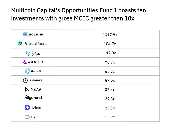 截止去年第三季度的數據顯示,Multicoin 第一期 VC fund 的 Gross MOIC 高達 114.7 倍,DPI 為 47 倍。Axios 去年底的一份報告還顯示,從成立時間算起 Multicoin 的對沖基金回報率約為 203 倍。