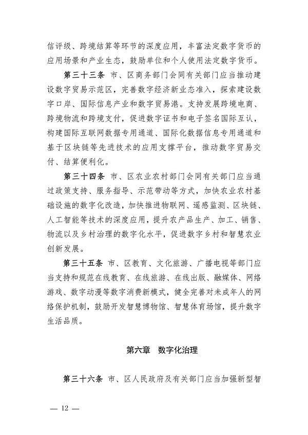 在產業數字化方面,《條例》提出通過數字貿易和農業農村基礎設施的數字化改造來推動產業數字化,一方面是支持發展跨境電商、跨境物流和跨境支付,促進數字證書和電子簽名國際互認,構建國際互聯網數據專用通道、國際化數據信息專用通道和基于區塊鏈等先進技術的應用支撐平臺,推動數字貿易交付、結算便利化。