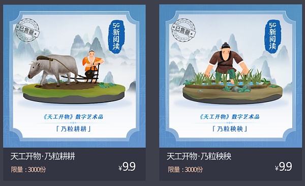 中圖云創和童趣出版有限公司聯合出品了全國首款科技典籍《天工開物》系列3D數字藏品《乃粒·耕耕》《乃粒·秧秧》,該系列數字藏品孵化于數字技術的深度集成以及實體圖書內容的多層創作,是“出版業首個脫胎于實體圖書的3D數字藏品”。