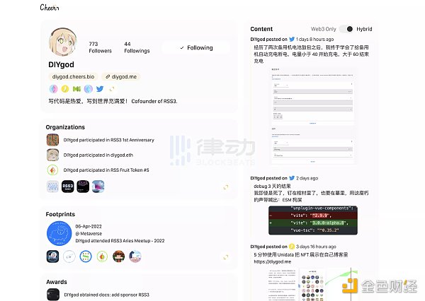 為了展示 RSS3 的應用場景,團隊才打造出了 Cheers.bio 等應用,幫助用戶一站式瀏覽好友的鏈上動態。而在 Joshua 看來,這也是為什么人們常對 RSS3 有誤解的原因,「因為在 RSS3 剛出來的時候基礎設施很匱乏,ENS 普及度也特別低。我們需要自己做 RNS、自己去綁定推特和 Mirror 等等,為了達到 (展示) 信息流這一件事,做了很多輔助的事情,導致很多人以為 Cheers 就是 RSS3」。