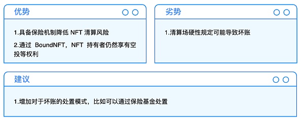 P2Pool 模式雖然可以增進資金利用率,但常會因為預言機、定價模型或單邊大行情出現導致倉位遭到清算而被迫進入拍賣場,倘若拍賣場又因為流動性問題而清算失敗,則又會導致清算金分配的問題。按照目前的運行邏輯,P2Pool 模式需要對參與借貸的 NFT 進行嚴格篩選,因此受眾相對有限。