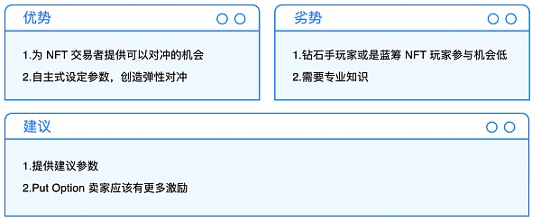 然而,這種模式會導致大部分鉆石手的 NFT 用戶不敢使用,縱然對沖掉了價格波動,但卻造成 NFT(Underlying Assets)的流失。在一般金融商品中便于在未來時間點內進行回補,但 NFT 的特殊性反而會造成應該行權但卻因為顧慮 NFT 流失的問題而不行權的狀態,反而有違項目設計本意。因此,使用情境上應該多為炒作的 NFT,才有機會在這個市場中流通。