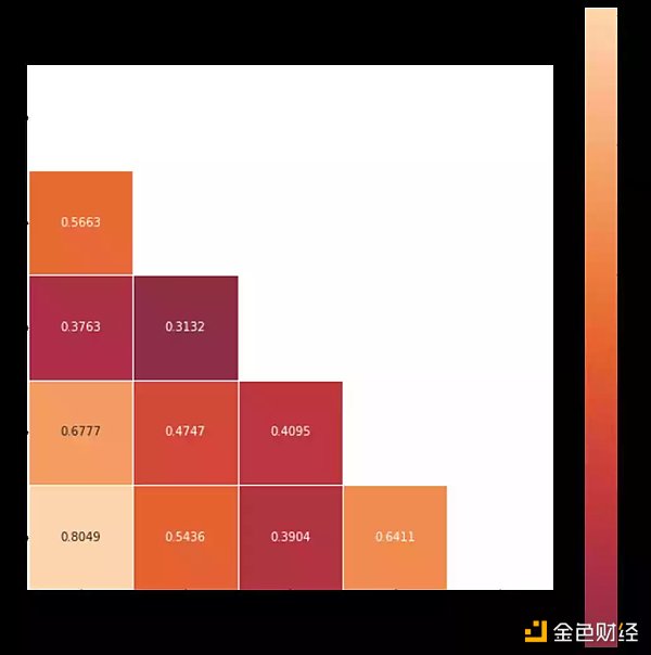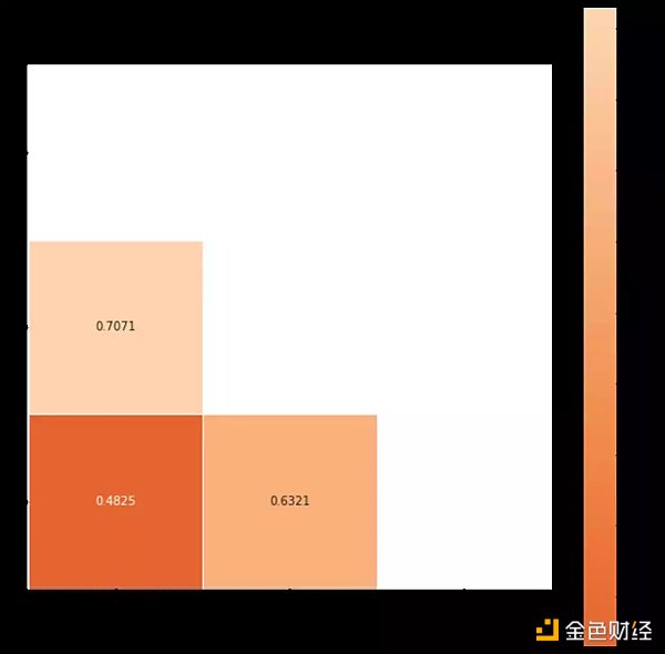 盡管 Mango 最近的財務管理活動并不真正構成互換,但我們認為,在我們回答回報相關性是否強的問題時,值得研究其購買 Marinade 質押的 SOL 而不是其最初購買 BTC 的計劃的決定 在 L1 生態系統中。我們檢查了可追溯到 Mango Token 下降(2021 年 9 月)前后的每日日志返回,以了解 BTC、SOL 和 MNGO 之間存在哪些相關性。具有 R2 值的相關矩陣如下圖所示: