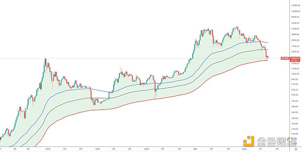 如圖所示,BTC周線或將再次測試圖中紅線支撐,6月初大跌插針反彈,根據長腿再探原則,后面往往還有個下探測試的過程,支撐區間17700-18000美金,我們可以發現前期熊市探底,有多次觸碰反彈再震蕩筑底,然后啟動牛市行情,所以關注這一帶周線能否有效支撐,穩住不破后面就有再次形成底部結構機會。