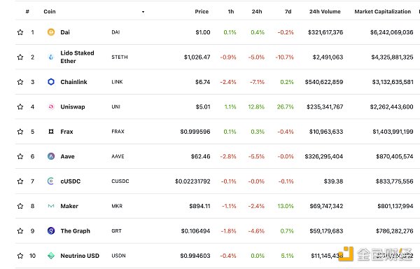 DeFi項目鎖定資產前十排名及鎖倉量 數據來源:defillama