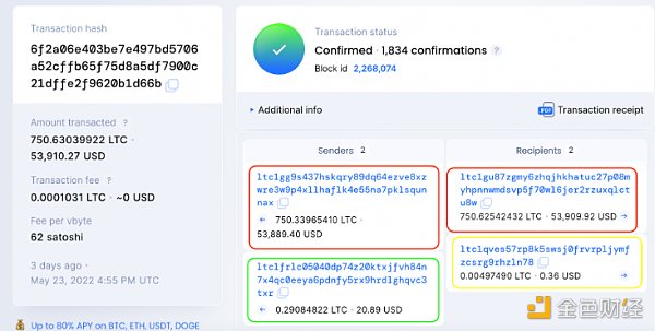 第一個發送者地址代表MWEB LTC從前一個擴展區塊移動到新的擴展區塊(接收地址ltc1g7w5j…),第二個發送者地址代表上面的掛鉤交易。