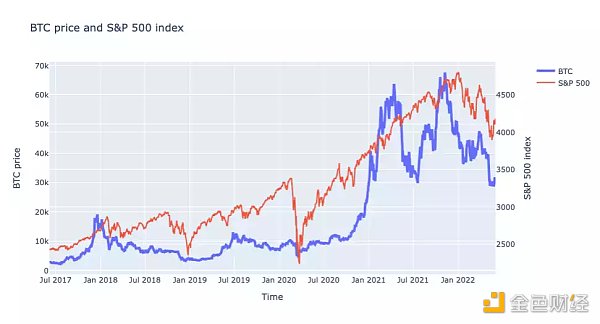 BTC 價格和 S&P 500 指數歷史走勢圖