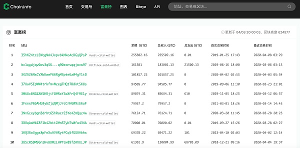 根據區塊鏈數據服務平臺Chain.Info數據顯示,截止4月8日20時,BTC余額排行榜顯示第一的地址是火幣冷錢包,余額約為25.55萬BTC。此外火幣還有另一個BTC余額排名前十的地址。約為7萬BTC。第二的地址則是Bitfinex冷錢包,余額約為16萬BTC。
