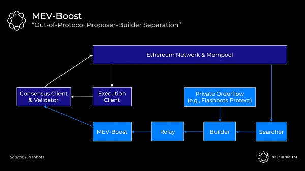 但是父母輩和常見的驗證者并不知道如何提取我們討論的 MEV,Flashbots 為此提供了替代方案,即 MEV-boost 將嵌入你的共識客戶端,允許你外包特定的區塊構建。重要的是,此時你仍可以選擇使用自己的執行客戶端作為后備。