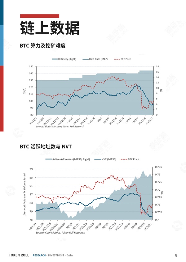 BTC難度在二月保持平穩,三月初小幅上升,同時,日均算力在三月初開始下降,截至3月23日,七日平均算力下降至94.3EH/s。BTC、ETH NVT比率均大幅下降,估值水平較低。
