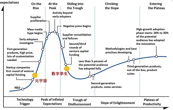 雖然Metaverse這個詞比Digital twin的概念原型的出現早了十年,但數字孿生技術體系的成熟度和國際標準化工作進展遠高于或快于元宇宙(圖5)。數字孿生技術在經歷了技術準備期、概念產生期和應用探索期后,正在進入大浪淘沙的領先應用期,即圖5高德納技術炒作曲線的谷底期;而元宇宙還處于技術準備期和概念產生期的早期階段,即圖5高德納技術炒作曲線左邊爬坡段的起點,還有至少二三十年漫長的技術研發、標準體系、道德和法律監管、乃至大國博弈等漫長的道路要走。