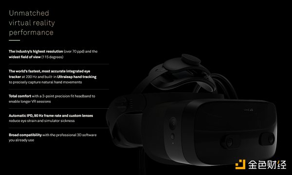 在 VR 頭顯領域,Meta 并不是唯一正在沖擊視網膜分辨率的廠家。高端頭顯品牌 Varjo 推出的 VR-3 型號頭顯已經超過了70ppd,甚至略微超過了行業認為的視網膜分辨率標準,而且可視角度達到了115°,比 Quest 2 的 110°還要稍微大一點。