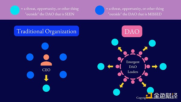 在一個傳統的組織中,CEO只看到一個威脅/機會/事情,而錯過了其他方面。在DAO中,領導者看到了所有面,因為有多個具有不同觀點的領導者在進行偵查。越多具有不同觀點的關鍵貢獻者領導DAO時,他們發現的威脅和機會就越多,DAO就越能靈活應對動蕩的局勢。