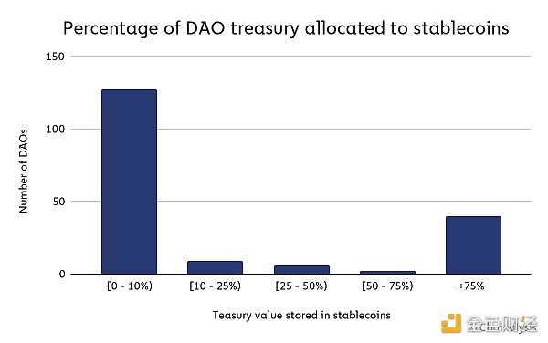 然而,穩定幣很少占鏈上國庫價值的大部分。平均而言,85% 的 DAO 鏈上金庫存儲在單一資產中,而在我們研究的 DAO 中,只有 23% 的資產是穩定幣。