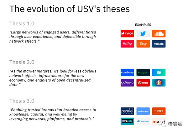 風險投資可以大致分為方法論驅動型和機會主義投資者。USV也許是一個最突出的例子,它對市場有一個明確的觀點,并根據其優點進行投資。迄今為止,USV已經連續擬定了三個論題,具體如下。