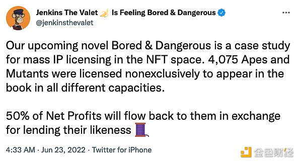 作為一個例子,Jenkins the Valet 正在發行一本由 Neil Strauss 寫的書,該書由「作家室」的持票人提供意見。這本書從 Bored Ape 和 Mutant Ape 的持有者那里獲得了角色授權,并與他們分享圖書銷售的利潤(作為 NFT 完成)。