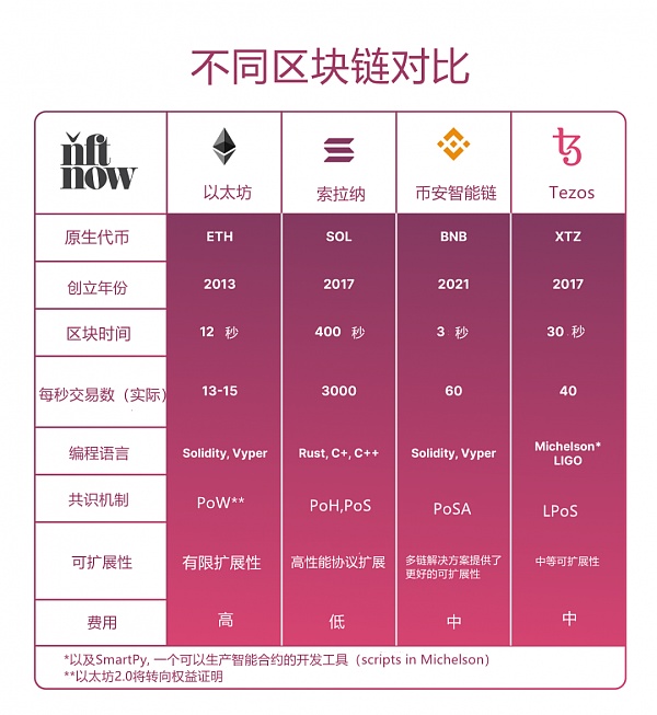 選擇在哪條區塊鏈上鑄造 NFT 時,要考慮到這些要點:網絡規模,創建成本,消費者的消費習慣,安全性和社區輸入。以下是對 NFT 區塊鏈的高度概括: